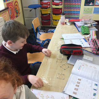 3rd class are identifying, classifying, describing and constructing 3D shapes in class this week. We are looking at how many corners, faces and edges each shape has. Have a look at some of the model shapes we constructed.